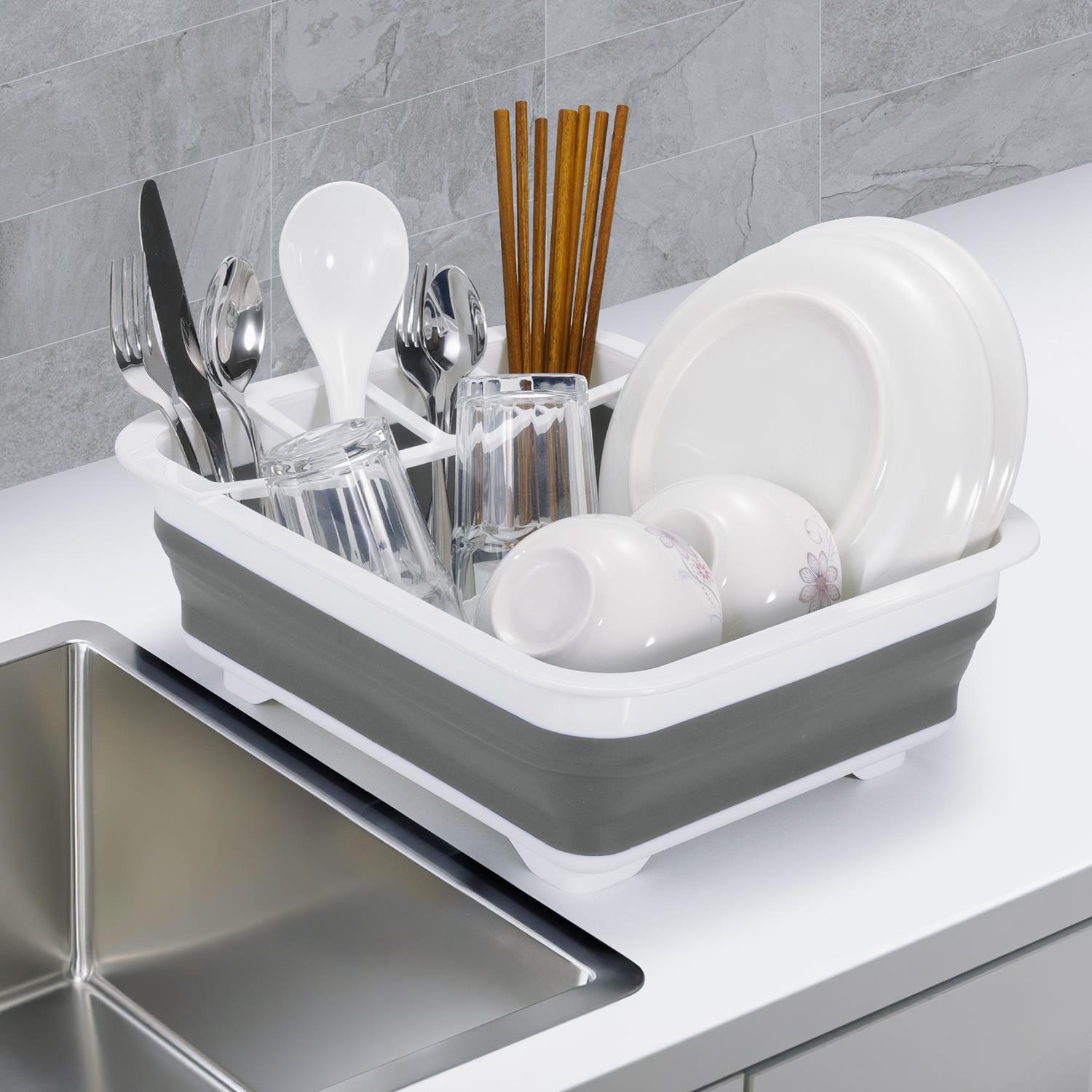 Expandable Dish Drainer Read More $ 27.41 at Amazon Fits over standard sinks, or place it in your sink to drain your clean dishes after washing! It provides a safe and convenient way to dry. VNKZI Over Sink Dish Drainer Drying Rack, 2 Tier Full Stainless Steel Storage Adjustable Length (25.98'' to 36.61'') Kitchen Rack, Multifunctional Expandable Counter Organizer, Space Saver Dish Rack
